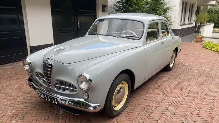 Alfa Romeo 1900 Berlina 1953, 'special equipment', eerste serie, Chassisnummer AR1900 *06599* Motornummer AR1306 *06738* Matching nummers motor en chassis. Aangekocht uit Italiaanse privéverzameling, juli 2022. Nieuw geleverd in San Remo, 8 oktober 1953 Verkocht door dealer (San Remo), 27 oktober 1953 Kleur: 'grigio chiarissimo' (auto nog steeds in de authentieke lichtgrijze kleur) In 73 jaar tijd vier, mogelijk vijf eigenaren (inclusief de laatste). Italiaans kenteken met technische en fiscale stempels. Nederlands kenteken sinds 2022. Potentiële Mille Miglia entrant gezien geschiedenis van het model en de zeldzaamheid van deze eerste serie en uitvoering. CARROSSERIE: Originele roestvrije carrosserie, zelfs de laspunten onder de dorpels zijn origineel en onbeschadigd zoals van 1953. De deurbakken, dorpels, en alle vloerdelen zijn volledig roestvrij. Enkele gebruikssporen met deukjes of krasjes, o.a. aan de zijkant van rechter achter scherm en linksboven op scherm zijn aanwezig. Op de motorkap enkel kleine deukjes t.g.v. 73 jaar gebruik. De lak is oud, hard en origineel. Hier en daar oppervlakkige blister, door ouderdom, geen roest. Fabriek originele kleur, idem toegepast in interieur (raamlijsten en dashboard, alles matching). Kenners (Alfa Romeo 1900 Register) ontraden om de auto over te spuiten. De carrosserie is 'Dans son jus d'origine' met de aantekening dat deze roestvrij, origineel en geheel 'period correct' is, uitzonderlijk voor een Alfa Romeo 1900. De auto kan beschouwd worden als ware 'Time warp'. Alle deuren en kleppen sluiten vlekkeloos met mooie fijne naden. Alle ruiten zijn onbeschadigd, met originele fabrieksinscripties, ook de voorruit is onbeschadigd en origineel. Alle rubbers zijn gaaf en mogelijk ooit vervangen. Geen gescheurde of droge rubbers, geen regenwater lekkage in het interieur. Alle sloten werken, het deurslot aan de bestuurderskant is vrij primitief. De veiligheidssluitingen werken uitstekend evenals alle draairaam mechanismen. De kofferbak is onbeschadigd, zowel de vloer als de reservewielbak. CHROOM EN CARROSERIE SIERDELEN: Volledig origineel, niets ontbreekt. Originele bumpers, grille delen, koplampranden, lampen, achterlichten, stadslichten, deurhendels, ruitenwisserarmen, chroomlijsten, nummerplaatverlichting. Minimaal roestplekje rechter achterste bumperdeel. Minimaal deukje in rechter horizontale spijl rechter grille deel. INTERIEUR: Origineel bekleed in authentieke lichtgrijze wollen stof met daarbij passend gaaf hoogpolig tapijt. Minimale gebruikssporen: zeer klein gaatje in stof van deurbekleding links voor (bestuurderskant) en een vlek laag op rugleuning rechtsvoor. Verder bijzonder fraai, sportief, comfortabel en onbeschadigd interieur met puntgave hemelbekleding. Stoelvullingen zeer goed. Nergens scheuren in de stoffen bekleding. Dashboard fraai en compleet met alle juiste instrumenten en schakelaars. Alles werkt goed, ook de schakelaars, verlichting, ruitenwissers, kachel, blower en meters. De meters zijn door zwakke verlichting en zachte kleuren in het donker niet eenvoudig af te lezen. Dit is een zeer opmerkelijk gaaf origineel interieur waar nooit iets beschadigd is. Zeer goed onderhouden, gekoesterd en gebruikt -zoals de hele auto- door enkele echte Italiaanse autoliefhebbers. De eerste twee eigenaren waren lady drivers, tot na 1965. MOTOR: Originele 1884cc 4 cilinder met dubbele bovenliggende nokkenassen. Stelbare klepschotels (Hispamo Suiza patent), aluminium cilinderkop met grote sodium gevulde kleppen, op gietijzer onderblok. Krachtige motor, rookt niet, excellente oliedruk, ook als de motor warm is en stationair draait. Start goed, zowel warme als koude start, zodra de mechanische benzinepomp de carburateur gevoed heeft. Geen bijgeluiden. Lichte olielekkage van carterpakking. De motor heeft de originele en optionele Weber 40 DCZ van Alfa Romeo met speciaal inlaatspruitstuk en bronzen spruitstuk en metaalgazen luchtfilter. Standaard Alfa Romeo uitlaatsysteem en uitlaatspruitstuk. Originele 1900 radiator van de 1ste serie. Geen waterverlies, geen verstopping. KOPPELING: Borg & Beck, enkele plaatkoppeling. Geen bijzonderheden, soms zeer lichte neiging tot schudden bij langzaam wegrijden. Slipt niet. Geen trillingen. VERSNELLINGSBAK: Originele 4-versnellingsbak met stuurschakeling (in jaren '50 'State of the Art'). Zeer goede synchromesh, schakelt goed zonder veel omwegen en zonder gekraak. Misschien even wennen aan stuurschakeling! REMMEN: Krachtig, rechte remweg, hard rempedaal. Geen lekkages. Rondom is remsysteem en voortrein door Italiaanse eigenaar gereviseerd. Gave remtrommels (stalen voering in aluminium geribde trommels). Handrem functioneert (van het 'paraplu' type). STUURINRICHTING: Vrij zwaar bij parkeermanoeuvres passend bij type auto. Geen stuurbekrachtiging in 1953! Stuur kogels spelingvrij. Een 'stuurmansauto': vooral op bochtige wegen zeer uitnodigend en onderhoudend. ACHTERAS: Geen bijzondere bijgeluiden, 'zingt' of 'huilt' niet. Zeer lichte olielekkage bij lang staan (pakking differentieel zweet iets door). BENZINETANK: In nieuwstaat. WIELEN: Origineel in origineel crême; geen beschadigingen; puntgaaf reservewiel. Fraaie chromen Alfa Romeo 1900 wieldoppen. BANDEN: Michelin-X 165x400 (origineel type fabrieksmontage). Zeer goed profiel, mogelijk wel van oudere datum. DOCUMENTEN: 'Licenza di Circulazione' (kenteken). Beschrijving eerste, tweede en derde eigenaar, respectievelijk, San Remo, Ventimiglia en Milano. Eerste eigenaar: 1953 (gegevens via Automobile Club d'Italia): Sofia Roggeri di Nicola. Tweede eigenaar: 1955 Anna Pittaluga (Ventimiglia), belastingen, jaarlijks afgestempeld tot 1965. Pittaluga is adelijk geslacht uit Ventimiglia. Derde (of vierde?) eigenaar: Ernesto Monti, Milano Laatste Italiaanse kenteken (gegevens PRA di Milan): 11279 IM (bij aankoop in 2022), hetzelfde kenteken waarop de auto vanaf 1953 geregistreerd stond. Laatste technische keuring Italië: 22.8.2022 (PRA) Nederlands kenteken. Certificato 