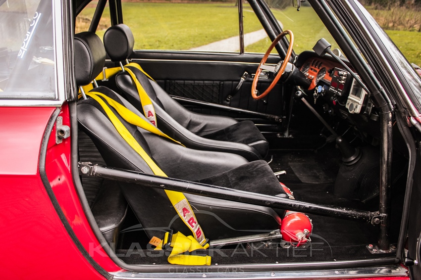 Het interieur is ook nog in goede staat. De zwartlederen sportstoelen zitten stevig en zijn (op wat gebruikerssporen na) in goede conditie. Deze Lancia Fulvia Coupe is voorzien van rally tripmaster, rolkooi, leeslampje, etc. Kortom, alle handige tools voor intensief rallygebruik. Het dashboard is in goede conditie en het houten dashboard en houten stuurwiel zijn niet alleen in goede staat, maar ook schitterend om te zien. De verschillende chroom- en sierdelen in het interieur zijn ook in goede conditie.