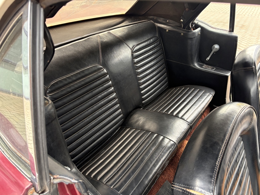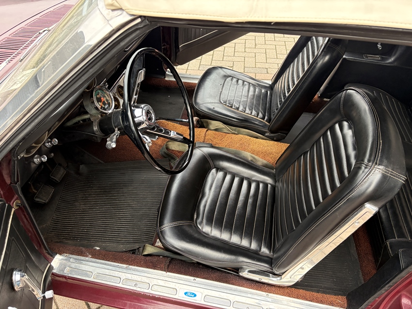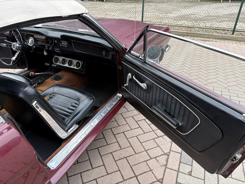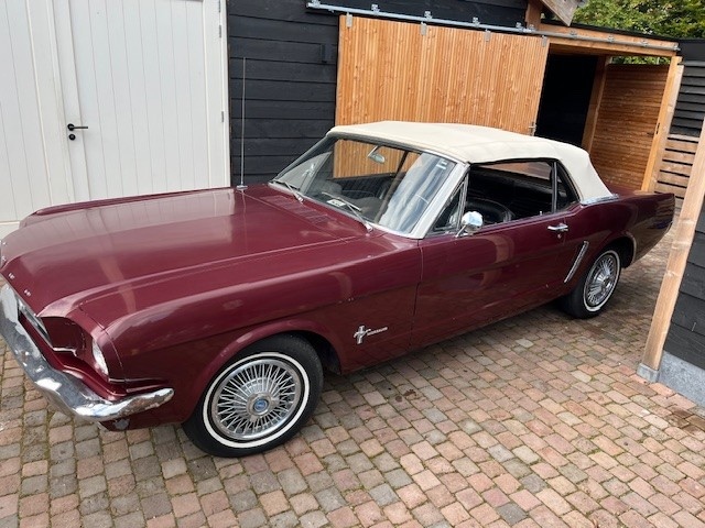 Deze Ford Mustang convertible uit 1965 met Nederlands kenteken stond tot 2020 33 jaar lang in de stalling. Hij is uitgevoerd in Vintage Burgundy met een zwart interieur en wordt aangedreven door een 200ci 6-cilinder motor, gecombineerd met een handgeschakelde 3-bak. De trommelremmen zijn gereviseerd en de auto heeft spaakwieldoppen, een witte softtop met 2 scheuren in het vinyl raam en een retro-look radio. De auto is uiterlijk niet perfect, maar heeft een heerlijke klassieke look. De 14-inch stalen velgen zijn voorzien van wieldoppen en banden met witte strepen. De auto heeft zwarte bekleding op de kuipstoelen en er is een radio met retro-look geïnstalleerd. De auto heeft een door de dealer geïnstalleerde airconditioning, maar deze werkt niet. Het instrumentarium bestaat uit een snelheidsmeter van 193 km/u, geflankeerd door meters voor het brandstofniveau en de koelvloeistoftemperatuur. De vijfcijferige kilometerteller geeft 46.158 Miles aan. De 200ci 6-cilinder had een fabrieksvermogen van 120 pk, dat via een handgeschakelde 3-bak en een achteras met een overbrengingsverhouding van 3,20:1 naar de achterwielen wordt gestuurd. De afgelopen vijf jaar is de radiator vervangen, de koppeling, verdeler, contactpunten, uitlaat en brandstofpomp vervangen. Recent is nog vervangen: Remleidingen, achterremmen, stuurkogels, stuurarmen. RDW goedgekeurd op 13-02-2026