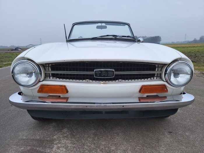 1973 Triumph TR6 CARROSSERIE EN LAK: Deze Triumph is qua lakwerk goed, wel her en der plekjes en verbeterpunten ( zie hiervoor de foto's) De auto zal na een goede poetsbeurt flink opknappen. Hij is vooral wat dof. De prachtige lijnen van de Triumph worden mooi getoond door de mooie witte kleur, in combinatie met het zwarte skai interieur. De rechterdeur zal voor het mooi iets beter afgesteld mogen worden. De deurrubbers zijn in nette staat en lijken recent te zijn vervangen. Het chroomwerk en decals/stickers zijn netjes. En straalt je tegemoet, geen rare roest of iets dergelijks op de bumpers. Evenals de verlichting die er mooi fris uitzien. Het cabriodak is netjes en heeft geen gaten/scheuren. Zou voor het mooie eens goed gereinigd kunnen worden. alle ruiten zijn nog in goede conditie Het onderstel is wel wat werk nodig, zie hiervoor de foto's van het chassis TECHNISCHE STAAT: De motor en versnellingsbak zijn in goede conditie. Wel is een onderhoudsbeurt nodig, denk hierbij aan nieuwe bougie's, olie etcetera. En het prachtige 6 cilinder geluid word door de originele uitlaten ter gehore gebracht. De banden hebben wel wat droogte scheurtjes. Wel zou aan het chassis een aantal laswerkzaamheden moeten worden gedaan, zie hiervoor de foto's voor een duidelijk beeld. En een goede tectylbehandeling zal niet overbodig wezen voor deze Triumph. Aan het onderstel is al veel vernieuwd, denkend aan fuseekogels, remslangen, rubbers en meer..... zie hiervoor de foto's. Voor een goed beeld van de auto is het verstandig eens te komen kijken. STAAT VAN HET INTERIEUR: Het interieur is in nette, gebruikte staat, heeft wel gebruikerssporen. Het dashboard heeft wat scheurtjes. her en der kleine beschadigingen, zie foto's DOCUMENTATIE: De Triumph is voorzien van Canadese papieren waarmee in heel Europa een registratie kan worden voldaan. Alle import-kosten zijn door ons voldaan, belasting en invoerrechten zijn BETAALD. TRANSPORT: Wij kunnen de Triumph wereldwijd transporteren tot aan uw voordeur, vraag naar de mogelijkheden