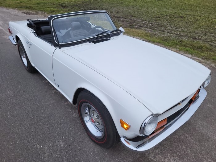1973 Triumph TR6 CARROSSERIE EN LAK: Deze Triumph is qua lakwerk goed, wel her en der plekjes en verbeterpunten ( zie hiervoor de foto's) De auto zal na een goede poetsbeurt flink opknappen. Hij is vooral wat dof. De prachtige lijnen van de Triumph worden mooi getoond door de mooie witte kleur, in combinatie met het zwarte skai interieur. De rechterdeur zal voor het mooi iets beter afgesteld mogen worden. De deurrubbers zijn in nette staat en lijken recent te zijn vervangen. Het chroomwerk en decals/stickers zijn netjes. En straalt je tegemoet, geen rare roest of iets dergelijks op de bumpers. Evenals de verlichting die er mooi fris uitzien. Het cabriodak is netjes en heeft geen gaten/scheuren. Zou voor het mooie eens goed gereinigd kunnen worden. alle ruiten zijn nog in goede conditie Het onderstel is wel wat werk nodig, zie hiervoor de foto's van het chassis TECHNISCHE STAAT: De motor en versnellingsbak zijn in goede conditie. Wel is een onderhoudsbeurt nodig, denk hierbij aan nieuwe bougie's, olie etcetera. En het prachtige 6 cilinder geluid word door de originele uitlaten ter gehore gebracht. De banden hebben wel wat droogte scheurtjes. Wel zou aan het chassis een aantal laswerkzaamheden moeten worden gedaan, zie hiervoor de foto's voor een duidelijk beeld. En een goede tectylbehandeling zal niet overbodig wezen voor deze Triumph. Aan het onderstel is al veel vernieuwd, denkend aan fuseekogels, remslangen, rubbers en meer..... zie hiervoor de foto's. Voor een goed beeld van de auto is het verstandig eens te komen kijken. STAAT VAN HET INTERIEUR: Het interieur is in nette, gebruikte staat, heeft wel gebruikerssporen. Het dashboard heeft wat scheurtjes. her en der kleine beschadigingen, zie foto's DOCUMENTATIE: De Triumph is voorzien van Canadese papieren waarmee in heel Europa een registratie kan worden voldaan. Alle import-kosten zijn door ons voldaan, belasting en invoerrechten zijn BETAALD. TRANSPORT: Wij kunnen de Triumph wereldwijd transporteren tot aan uw voordeur, vraag naar de mogelijkheden