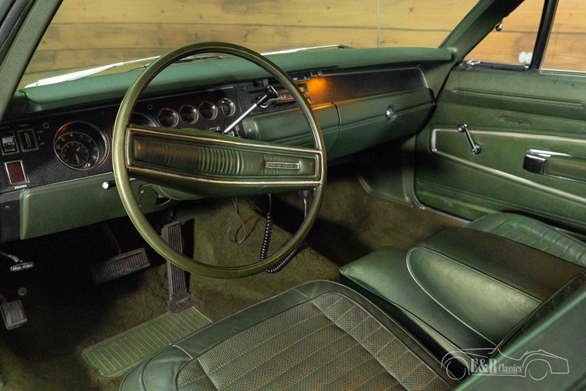Donkergroen metallic Dodge Charger 500 te koop Ook qua uitstraling weet deze Dodge indruk te maken. De carrosserie is uitgevoerd in een stijlvol donkergroen metallic lakwerk dat prachtig samengaat met het groene vinyl dak, een karakteristiek detail dat perfect past bij de jaren ’70 uitstraling van de Charger. De stoere stance wordt versterkt door de klassieke velgen met BF Goodrich banden. Het interieur is uitgevoerd in een bijpassend donkergroen en vormt een harmonieus geheel met de buitenzijde van de auto. Het dashboard, de stoelen en de deurpanelen verkeren in een verzorgde staat en ademen de authentieke sfeer van een Amerikaanse muscle car uit deze periode.