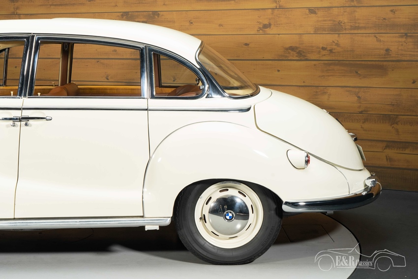 Witte BMW 502 met schuifdak te koop Ook qua uitstraling maakt deze BMW direct indruk. De elegante carrosserie is uitgevoerd in een stijlvolle lichte lak die prachtig combineert met de vele chroomdetails en de karakteristieke BMW-nierengrille. De klassieke wieldeksels en sierlijke lijnen onderstrepen het statige karakter van deze jaren zestig luxeauto. Een bijzonder detail is het schuifdak, dat zorgt voor extra rijplezier op mooie dagen. Het interieur sluit perfect aan bij het exterieur en is uitgevoerd in een warm bruin interieur, dat fraai contrasteert met het lichte lakwerk. Het dashboard met houtafwerking, het klassieke stuurwiel en de comfortabele zitplaatsen creëren een luxueuze en authentieke sfeer die perfect past bij het karakter van deze bijzondere BMW.