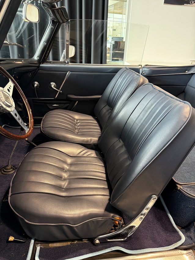 DE BEKLEDING IS IN BLAUW EN DAK IS IN MOHAIR ZWARTE STOF. ER IS EEN GROTE EN KLEINE TONEAU COVER IN BLAUW .