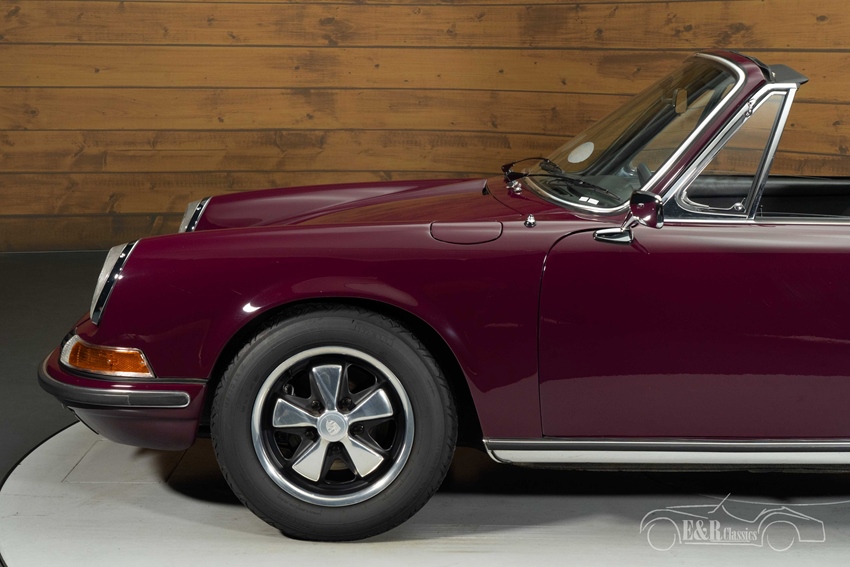 Porsche 911T Targa Ölklappe te koop in Aubergine lakwerk Het exterieur is uitgevoerd in het originele aubergine lakwerk, een diepe en chique kleur die de elegante lijnen van de 911 perfect accentueert. In combinatie met de kenmerkende Targa-beugel in geborsteld RVS en de klassieke Fuchs-velgen ontstaat een tijdloos en stijlvol geheel. Het lakwerk presenteert zich in een zeer verzorgde staat met een mooie glans, passend bij het niveau van de restauratie. Het interieur is uitgevoerd in zwart en vormt een prachtig contrast met de buitenzijde. De stoelen, het dashboard en de karakteristieke klokken ademen de pure Porsche-beleving van de jaren ’70 en verkeren in een nette, authentieke conditie. Deze Porsche combineert zeldzaamheid, historie en uitstraling op een manier die maar zelden wordt aangeboden.