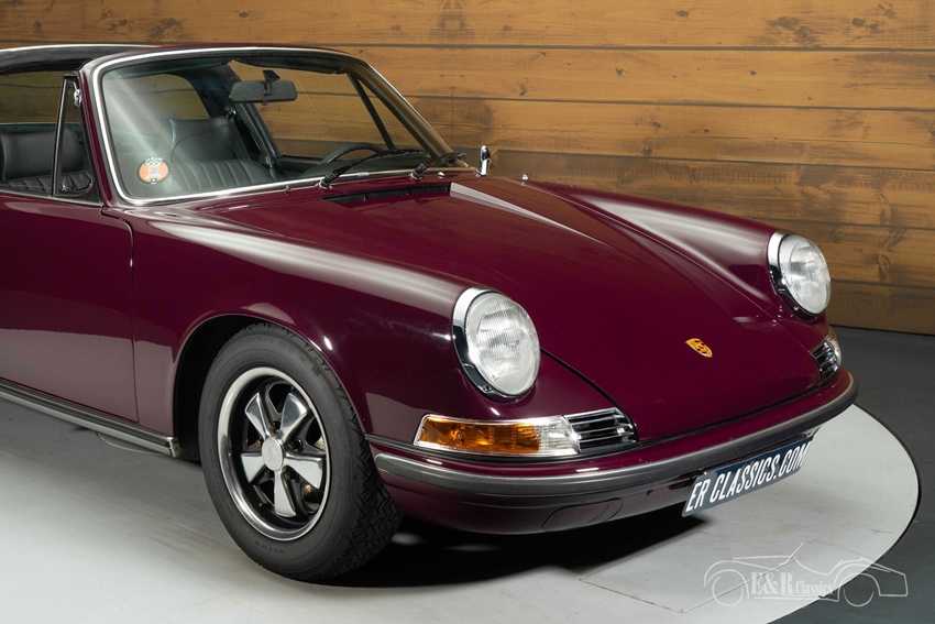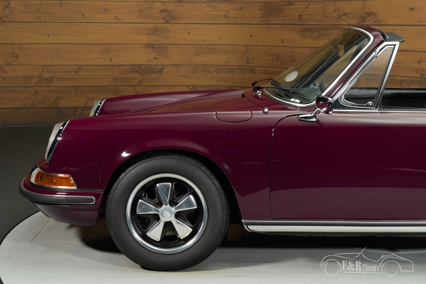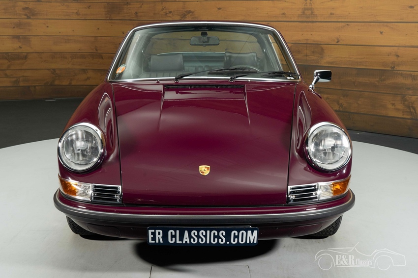 Porsche 911T Targa Ölklappe te koop in Aubergine lakwerk Het exterieur is uitgevoerd in het originele aubergine lakwerk, een diepe en chique kleur die de elegante lijnen van de 911 perfect accentueert. In combinatie met de kenmerkende Targa-beugel in geborsteld RVS en de klassieke Fuchs-velgen ontstaat een tijdloos en stijlvol geheel. Het lakwerk presenteert zich in een zeer verzorgde staat met een mooie glans, passend bij het niveau van de restauratie. Het interieur is uitgevoerd in zwart en vormt een prachtig contrast met de buitenzijde. De stoelen, het dashboard en de karakteristieke klokken ademen de pure Porsche-beleving van de jaren ’70 en verkeren in een nette, authentieke conditie. Deze Porsche combineert zeldzaamheid, historie en uitstraling op een manier die maar zelden wordt aangeboden.