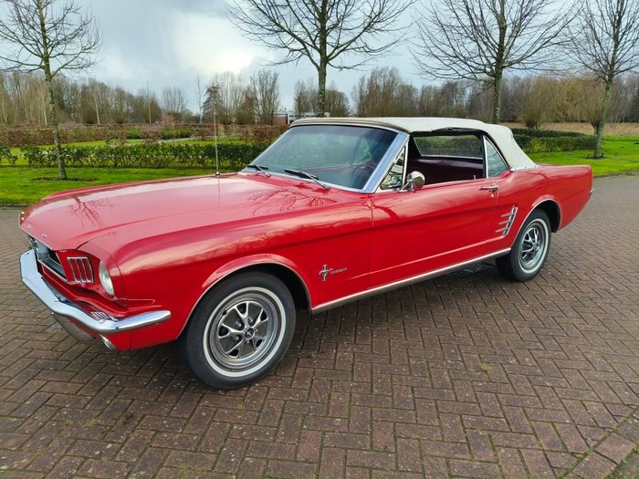1966 Ford Mustang Convertible ALGEMEEN: Te koop aangeboden: 1966 Ford Mustang Convertible! Een originele klassieker in de schitterende kleur Candy Red. Deze Mustang is uitgerust met een aangepaste 6 cilinder motor met een andere nokkenas, 6 in 1 Uitlaat spruitstuk en sport uitlaat combineert tijdloze styling met een sportief cabriolet-gevoel. Een auto met historie, van een long term owner, die perfect is voor liefhebbers van klassieke Mustangs. Bovendien is de auto in California gebouwd en ze heeft daar ook lange tijd rondgereden in het warme klimaat CARROSSERIE & LAKWERK: De auto is recent in Europa gespoten (Duits), heeft geen roest, een strakke carrosserie en mooie lijnen. De originele Candy Red lak oogt fraai en benadrukt de vloeiende vormen van deze cabriolet, wat zorgt voor een opvallende en elegante uitstraling. Er is een compleet nieuw cabriodak gemonteerd. TECHNISCH: Onder de motorkap ligt de betrouwbare 6 cilinder , gekoppeld aan een soepele transmissie. De auto rijdt zoals een klassieke Mustang hoort: krachtig, soepel en met een karakteristiek geluid. De techniek is goed onderhouden, waardoor deze cabriolet direct klaar is om te genieten. Auto heeft roestvrije vloeren en is zeer goed onderhouden door de vorige Duitse eigenaar INTERIEUR: Het interieur is uitgevoerd met comfortabele stoelen en een klassieke uitstraling die perfect past bij de auto. Het prachtige originele stuurwiel maakt het geheel compleet en versterkt het authentieke rijgevoel van een jaren '60 Mustang Convertible. DOCUMENTEN: Wordt geleverd met de benodigde documentatie die registratie in Europa mogelijk maakt. AFHALING: De Mustang kan na afloop van de veiling worden opgehaald in Appingedam. Transport kan in overleg geregeld worden. OVERIGE INFORMATIE: Deze 1966 Ford Mustang Convertible T-Code in originele Candy Red is een bijzondere klassieker met karakter en historie. Een auto van een long term owner, klaar om zowel te rijden als te bewonderen op shows. OVERIGE INFORMATIE: Een kans om een van de meest gewilde Amerikaanse Cabrio's te bemachtigen Perfect voor verzamelaars, liefhebbers of als investering die alleen maar in waarde kan stijgen