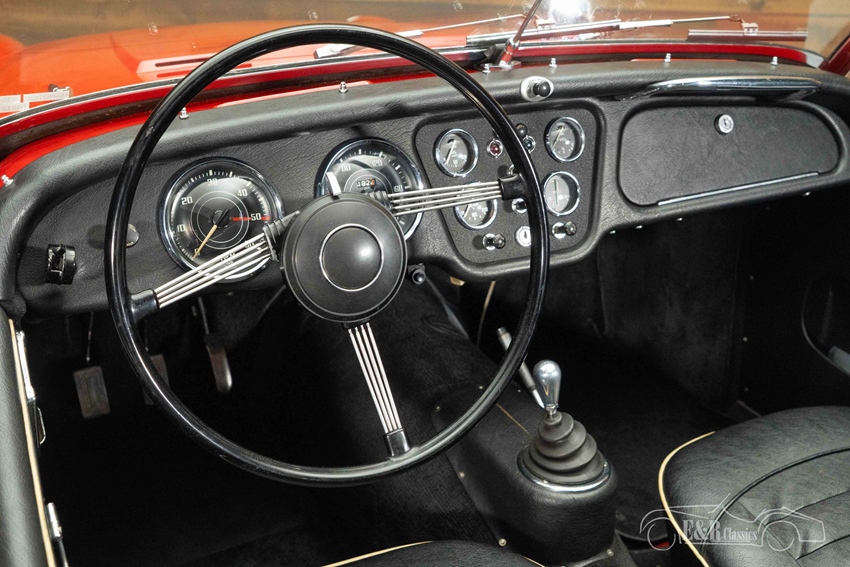 Rode Triumph TR3A met hard top te koop Het uiterlijk van deze TR3A is een lust voor het oog, uitgevoerd in stijlvol rood lakwerk dat prachtig contrasteert met de zwarte softtop en bijpassende hardtop. De gespoten spaakwielen en het chromen bagagerek achterop versterken het klassieke karakter van de auto. Het interieur is afgewerkt met zwarte bekleding met witte piping, wat zorgt voor een elegante en sportieve uitstraling. Daarnaast is deze Triumph zeer compleet uitgevoerd met een hardtop, softtop én tonneaucover, waardoor u in elke situatie van deze open sportwagen kunt genieten.
