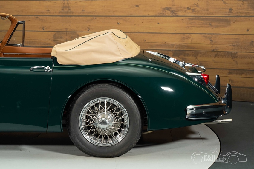 Jaguar XK150 Cabriolet in British Racing Green te koop Het exterieur is uitgevoerd in het iconische British Racing Green lakwerk, dat prachtig contrasteert met de beige soft top en de klassieke chromen spaakwielen. De elegante lijnen en verfijnde details geven de auto een tijdloze uitstraling, zowel met gesloten als open dak. Het interieur is afgewerkt in stijlvol cinnamon bruin leder, dat een warme en luxe sfeer creëert en perfect harmonieert met het diepe groen van de carrosserie. De hoogwaardige afwerking, het klassieke dashboard en de comfortabele zitpositie maken elke rit tot een bijzondere ervaring, geheel in lijn met het karakter van deze Britse klassieker.