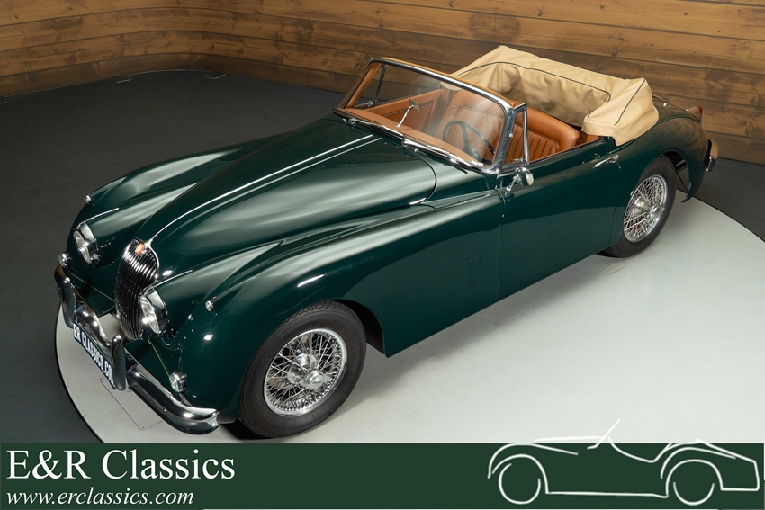Jaguar XK150 Cabriolet in British Racing Green te koop Het exterieur is uitgevoerd in het iconische British Racing Green lakwerk, dat prachtig contrasteert met de beige soft top en de klassieke chromen spaakwielen. De elegante lijnen en verfijnde details geven de auto een tijdloze uitstraling, zowel met gesloten als open dak. Het interieur is afgewerkt in stijlvol cinnamon bruin leder, dat een warme en luxe sfeer creƫert en perfect harmonieert met het diepe groen van de carrosserie. De hoogwaardige afwerking, het klassieke dashboard en de comfortabele zitpositie maken elke rit tot een bijzondere ervaring, geheel in lijn met het karakter van deze Britse klassieker.
