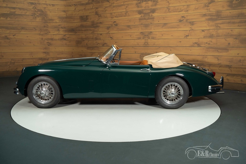 Jaguar XK150 Cabriolet in British Racing Green te koop Het exterieur is uitgevoerd in het iconische British Racing Green lakwerk, dat prachtig contrasteert met de beige soft top en de klassieke chromen spaakwielen. De elegante lijnen en verfijnde details geven de auto een tijdloze uitstraling, zowel met gesloten als open dak. Het interieur is afgewerkt in stijlvol cinnamon bruin leder, dat een warme en luxe sfeer creƫert en perfect harmonieert met het diepe groen van de carrosserie. De hoogwaardige afwerking, het klassieke dashboard en de comfortabele zitpositie maken elke rit tot een bijzondere ervaring, geheel in lijn met het karakter van deze Britse klassieker.
