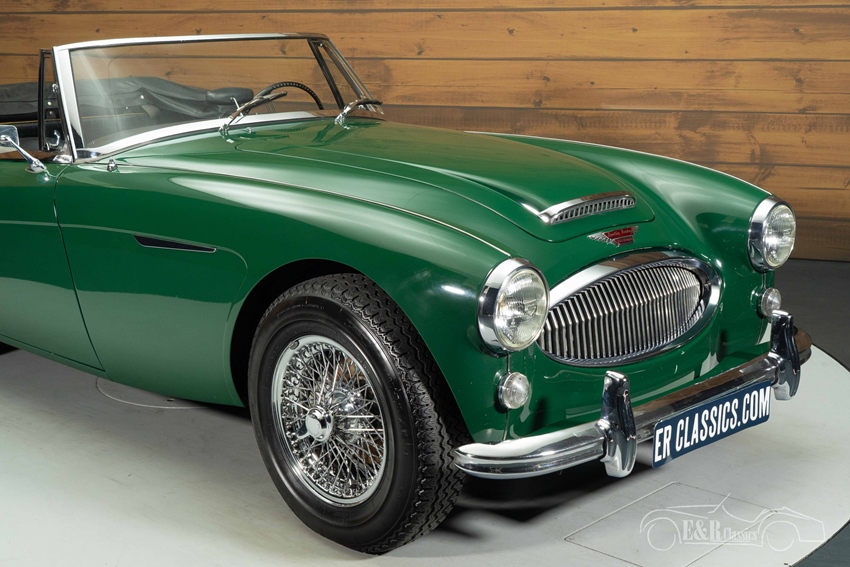 Austin-Healey 3000 MK3 in British Racing Green te koop Het uiterlijk van deze Austin Healey is uitgevoerd in het iconische British Racing Green lakwerk dat prachtig contrasteert met de vele chromen accenten en de klassieke chromen spaakwielen. De lijnen van de carrosserie komen hierdoor extra goed tot hun recht en geven de auto een elegante, sportieve uitstraling. De zwarte soft top sluit naadloos aan bij het geheel en maakt de auto zowel open als gesloten een lust voor het oog. Het interieur is uitgevoerd in stijlvol zwart en verkeert in een verzorgde staat, met comfortabele stoelen en een fraai houten dashboard dat perfect harmonieert met het exterieur. Alles samen vormt dit een klassiek Britse sportwagenbeleving pur sang, waarin stijl, comfort en rijplezier samenkomen.