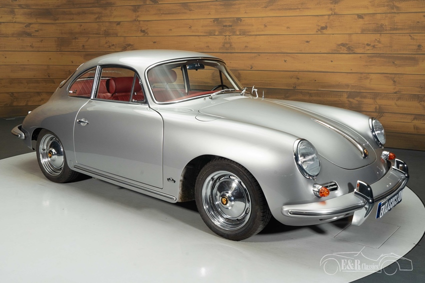 Zilvergrijs metallic Porsche 356B Coupe te koop Het exterieur is uitgevoerd in een stijlvol zilvergrijs metallic lakwerk dat perfect de tijdloze lijnen van de 356 benadrukt. De klassieke chromen details, originele velgen en subtiele afwerking zorgen voor een elegante en authentieke uitstraling. Het interieur vormt een prachtig contrast met zijn bordeaux rood lederen bekleding, die luxe en sportiviteit op harmonieuze wijze combineert. Het dashboard met zijn karakteristieke meters, het dunne stuurwiel en de minimalistische afwerking brengen u direct terug naar de jaren zestig, terwijl de hoogwaardige restauratie zorgt voor een frisse en verzorgde indruk. Alles aan deze Porsche ademt klasse, originaliteit en rijplezier.