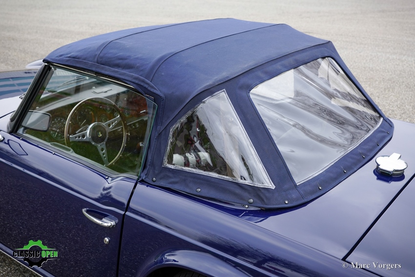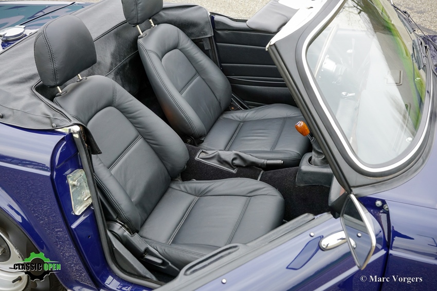 Exterieur uitgevoerd in donkerblauw, gecombineerd met een zwart interieur met zwarte lederen stoelen en zwarte vloerbedekking. Voorzien van een blauwe mohair soft-top en een zwarte vinyl afdekhoes.