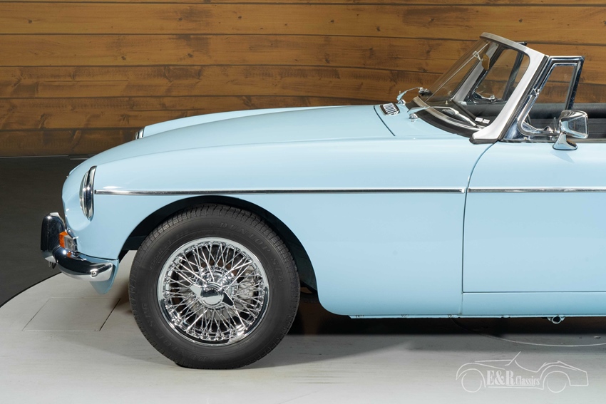 Babyblauwe MG MGB Cabriolet te koop Het uiterlijk van deze MGB is een absolute blikvanger dankzij het stijlvolle babyblauwe lakwerk, dat perfect past bij de elegante lijnen van de carrosserie. De chromen spaakwielen geven de auto een extra klassiek en sportief karakter, terwijl de zwarte soft top zorgt voor een fraai contrast en praktisch gebruiksgemak. Het interieur is uitgevoerd in zwarte bekleding met subtiele blauwe piping, wat prachtig aansluit bij de exterieurkleur en zorgt voor een harmonieus geheel. Het dashboard en de klassieke instrumenten stralen authenticiteit uit en versterken de pure rijbeleving die deze Britse cabriolet zo geliefd maakt.