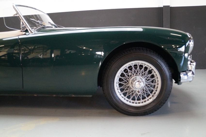 Uitgevoerd in British Racing Green met een cognac kleurig volledig lederen interieur, biedt deze MGA een tijdloze en bijzonder geslaagde kleurcombinatie. Het diepe groen van de carrosserie vormt een mooi contrast met de warme tinten van het interieur en geeft de auto een klassieke en uitnodigende uitstraling.