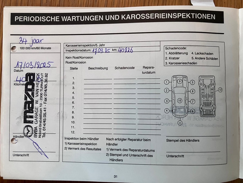 Volledige onderhoudshistoriek bij Mazda dealer, OH boekje compleet over 35 jaar. . Alle facturen aanwezig. Laatste groot onderhoud maart 2025, met o.a. vervanging distributieriem. Prijs te bespreken. tel: 0475/613912
