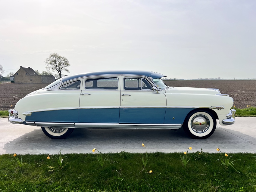 Stap in een echt stukje Americana uit de jaren 50. Deze Hudson Hornet uit 1953 heeft die lange, lage "step-down" houding, veel chroom en een uitstraling die moderne auto's simpelweg niet kunnen evenaren. De crème- en zachtblauwe two-tone lak is niet perfect, maar geeft de auto karakter en maakt hem onmogelijk te negeren waar hij ook komt. Van de gedurfde chromen grille en motorkapornament tot de whitewalls en sierlijsten langs de zijkant — deze Hornet weet nog steeds hoe hij de show moet stelen en elke rit bijzonder maakt.