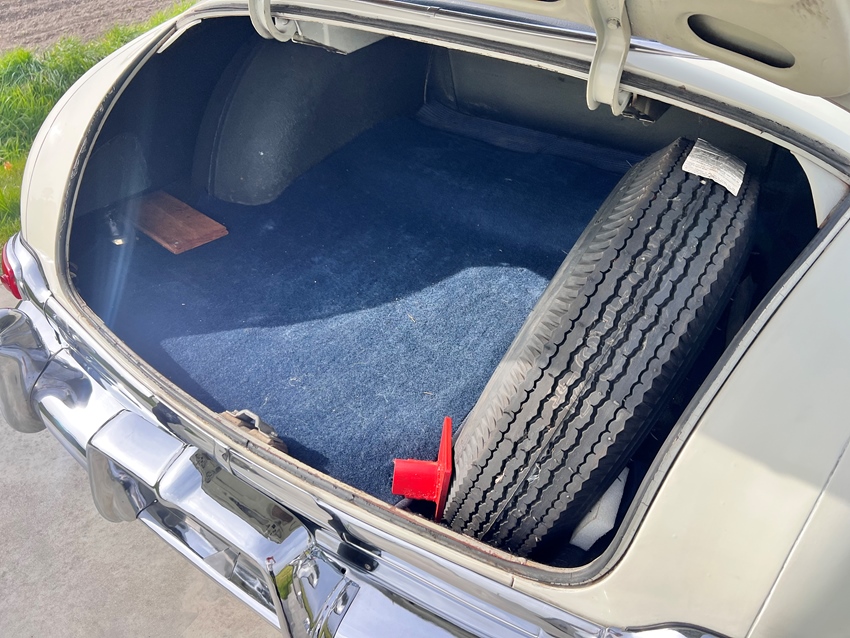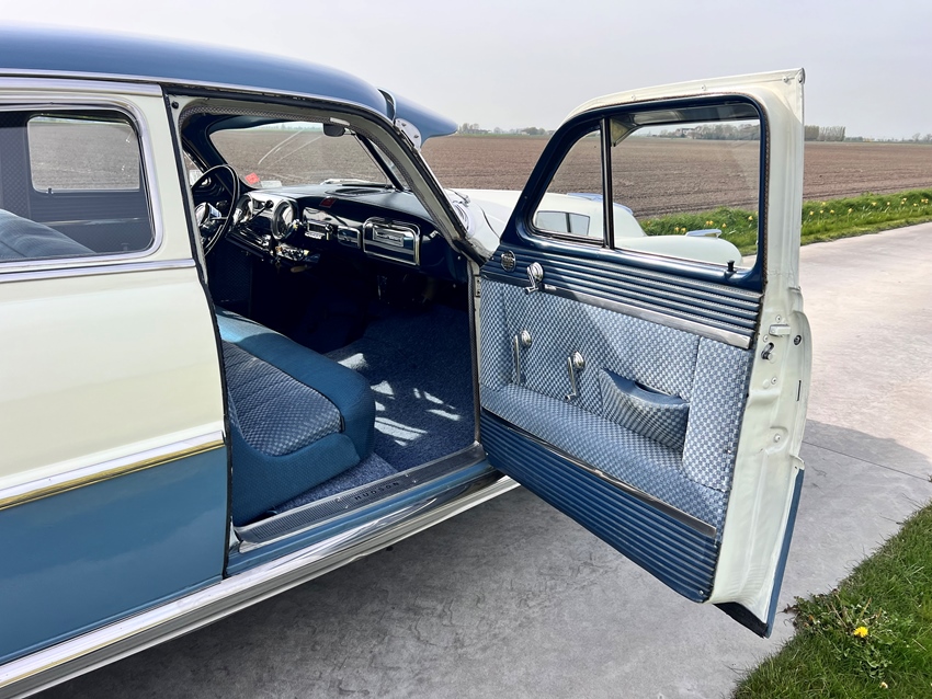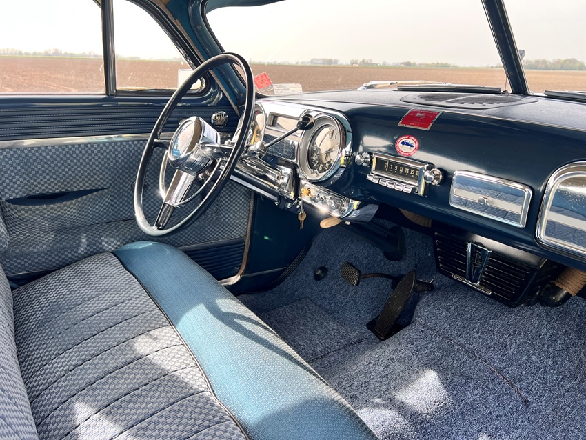 Stap naar binnen en je wordt verwelkomd door een prachtig gerestaureerd interieur dat perfect past bij de vintage charme. Het interieur is volledig vernieuwd en ziet er fantastisch uit, met nieuwe bekleding in klassieke blauwtinten die mooi aansluiten bij de two-tone lak. Het grote chromen stuur, glanzende dashboarddetails en period-correcte meters geven een authentiek jaren-50 gevoel, terwijl de nette tapijten en frisse afwerking het geheel uitnodigend maken. Een perfecte mix van klassieke stijl en vernieuwde presentatie, waarbij de chroomdetails echt de show stelen.