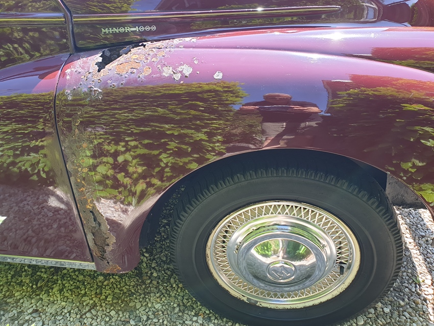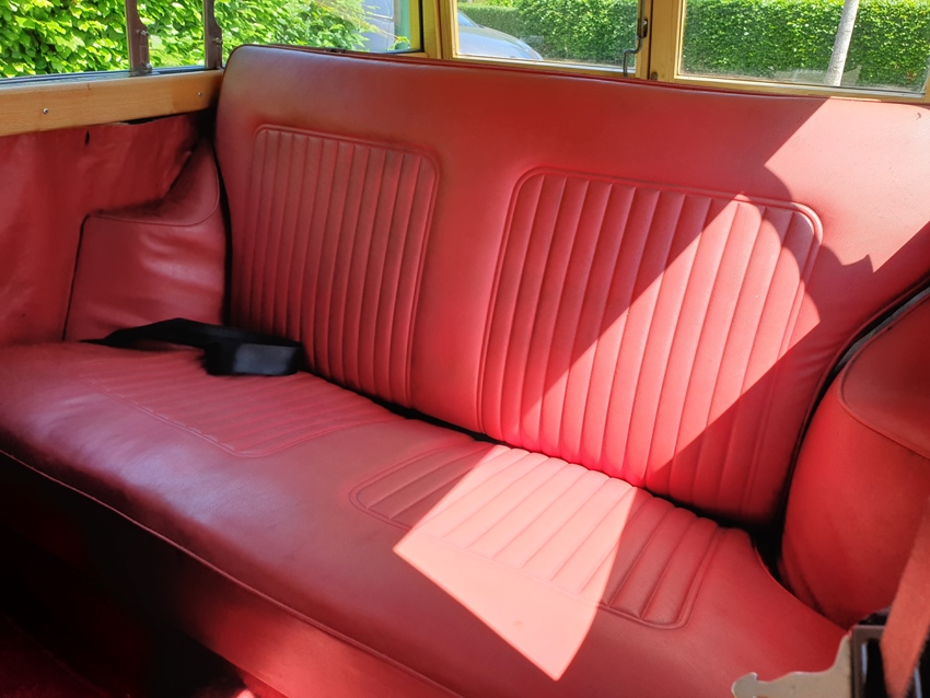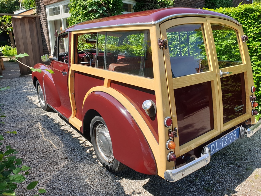 Donkerrode (Maroon) Morris Minor Traveller 1968, LINKS gestuurd.