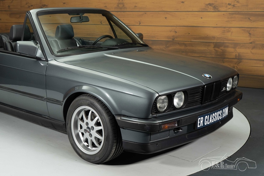 BMW 320i E30 Cabriolet in antraciet te koop Het exterieur is uitgevoerd in stijlvol antracietkleurig lakwerk, wat prachtig contrasteert met de zwarte soft top en de klassieke lijnen van de carrosserie. De tijdloze vormgeving wordt versterkt door de lichtmetalen velgen, die perfect passen bij het karakter van de auto. Het interieur is voorzien van een zwart lederen bekleding, die een mooie patina toont en bijdraagt aan de authentieke uitstraling. Het samenspel tussen het donkere exterieur en het zwarte interieur zorgt voor een chique en sportieve uitstraling, geheel in lijn met waar BMW in deze periode voor stond.