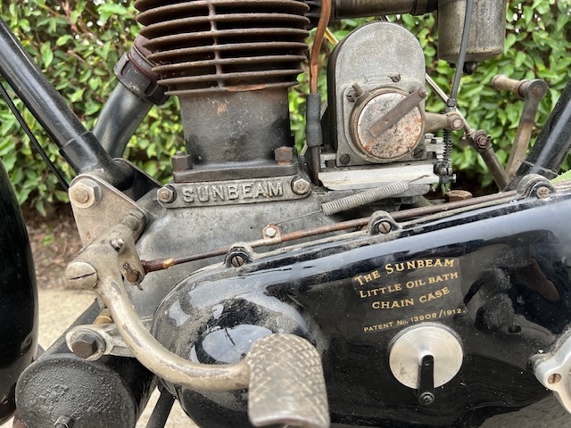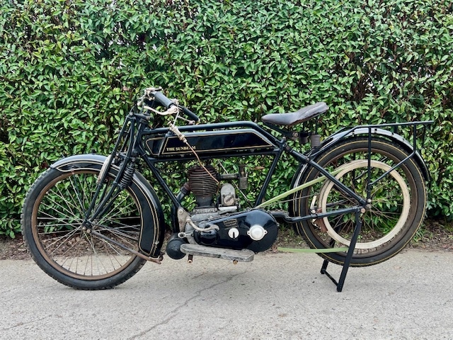 Engelse Sunbeam 4HP 550cc model met riemaandrijving. In WOI werden vele Sunbeams geleverd aan Rusland en andere landen maar de grootste afnemer was het Britse Royal Naval Air Service, de voorloper van de Britse luchtmacht. Dit waren allemaal 500cc met kettingaandrijving. Frankrijk bestelde 1000 motorfietsen maar met een 550cc blok en met riemaandrijving. Dit is nu een zeer zeldzame verschijning. Ondertussen zijn er bij de Marston Sunbeam Register 9 van deze motorfietsen. bekend... sorry met deze erbij 10 want tot nu toe was deze onbekend doordat hij vele jaren in Frankrijk in een privé verzameling heeft gestaan. Motorfiets is een oude restauratie die nu een volledig nazicht en revisie heeft gehad en is in perfect lopende staat. Motor en versnellingsbak zijn gereviseerd en start en loopt mooi. Deze motorfiets heeft het laagste bekende motornummer. Productie is gestart in 1916 tot 1918. Je kan ook de letters GS zien wat slaagt op Generale Service, het Franse voor legerdienst.