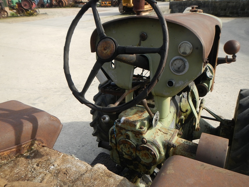 Slanzi tractor, model Amico D51 with DV15T Slanzi diesel engine. All-wheel drive, very compact tractor, built in 1953, in good running condition. Unseen at the time, 2,25m short, weighing only 1325kg, all-wheel drive with equal wheels, and very economical twin cylinder 15 Hp watercooled diesel engine with an advertised pulling power in excess of 1000 kg.