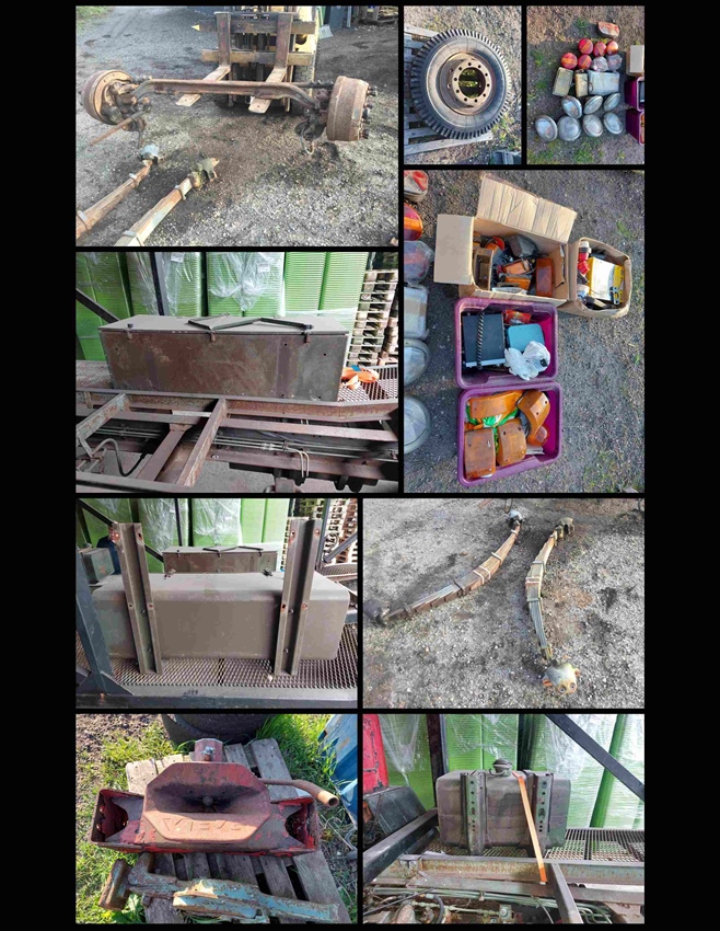 Er zijn tevens twee stalen kisten met steunen en reservetank aanwezig. Dakrek, stalen zonneklep et cetera. Tevens nog te koop twee zeer gave cabines LB. Diverse nieuw plaatmaterialen, nieuwe deuren, gebruikte deuren. Twee motoren. Vrijwel nieuwe banden. Zie ook de materiaallijst. Zeer veel reserve-onderdelen waaronder ook moeilijk verkrijgbare zoals bakelieten stuur. originele clignoteurs.