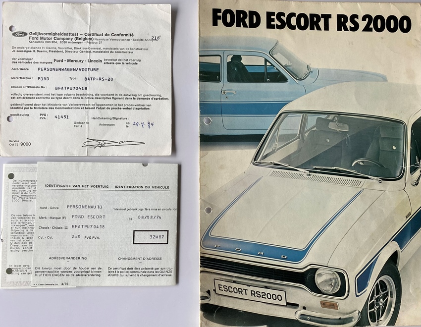 Voor verzamelaars AANKOOPFACTUUR , INSCHRIJVINGSBEWIJS ; GELIJKVORMIGHEIDSATTEST en VERKOOPBROCHURE van MIJN FORD ESCORT 2000 RS VAN 1974