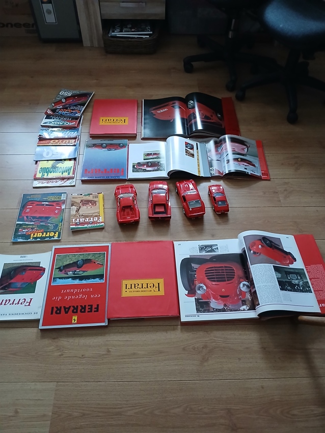 Diverse Ferrari Boeken en een modelletje en een showroom poster